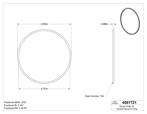 Dört tarafı da düz kenarlı olan bu O-ringler, yuvarlak profilli O-ringlerden daha geniş yüzey alanıyla temas eder. Artan temas, hortum, boru ve musluk bağlantıları gibi statik uygulamalarda daha iyi sızdırmazlık sağlar. Ancak düz kenarlar daha fazla sürtünmeye ve aşınmaya neden olduğu için dinamik uygulamalarda o kadar iyi bir tercih değildir. Buna-N malzemeden üretilmiş olup yırtılmaya dayanıklıdır ve hidrolik ile motor yağlarına dayanır.