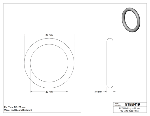 Bu O-ringleri aseptik bağlantı elemanları olarak da bilinen metrik hijyenik bağlantı elemanlarıyla birlikte kullanın. EPDM malzemeden üretilmiş olup suya, buhara, etanole ve etilen glikole dayanıklıdır. Hijyenik tasarım standartlarını karşılamak üzere 3-A sertifikalıdır. Yuvarlak profile sahiptir ve çok çeşitli statik ve dinamik sızdırmazlık uygulamaları için uygundur.