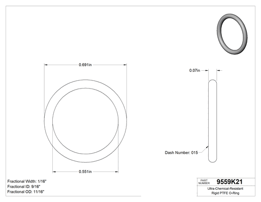 PTFE'den üretilen bu O-ringler aşırı sıcaklıklara ve aseton, florlu çözücüler ve etanol gibi agresif kimyasallara dayanır. Ayrıca serttir, bu da esnek O-ringlere göre montajını zorlaştırır. Bu O-ringler genellikle pompa milleri, karıştırma tankları ve kimyasal veya ilaç işleyen diğer ekipmanların sızdırmazlığında kullanılır. Ayrıca gıda ile doğrudan temas için FDA uyumludur. Tümünde kürleme tarihi ve izlenebilir lot numarası ambalajda yazmaktadır.