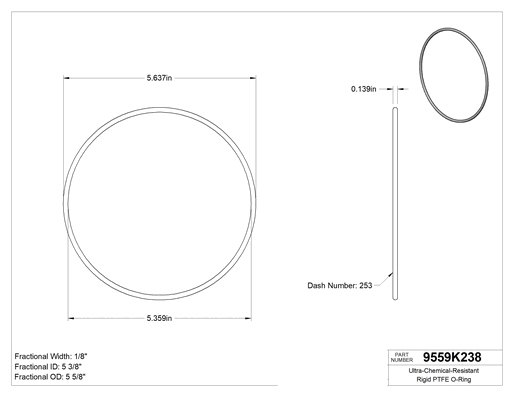 PTFE'den üretilen bu O-ringler aşırı sıcaklıklara ve aseton, florlu çözücüler ve etanol gibi agresif kimyasallara dayanır. Ayrıca serttir, bu da esnek O-ringlere göre montajını zorlaştırır. Bu O-ringler genellikle pompa milleri, karıştırma tankları ve kimyasal veya ilaç işleyen diğer ekipmanların sızdırmazlığında kullanılır. Ayrıca gıda ile doğrudan temas için FDA uyumludur. Tümünde kürleme tarihi ve izlenebilir lot numarası ambalajda yazmaktadır.